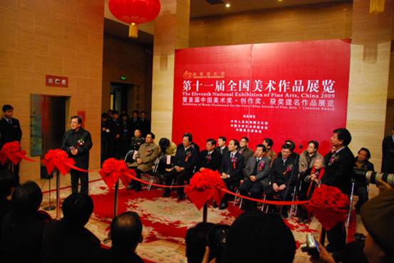 2009年9月第十一届全国美展20余个画种,在全国分10个展区大规模展出,图为第十一届全国美术作品展览暨首届“中国美术奖”创作奖获奖作品展览开幕式在中国美术馆举行