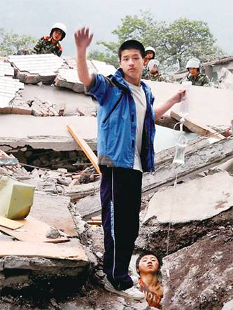 2008年5月13日,3岁的郎铮被解放军从北川县曲山镇幼儿园废墟中救出,获救后他向解放军叔叔敬礼,感动了整个中国,被称为“敬礼娃娃”。杨卫华/摄