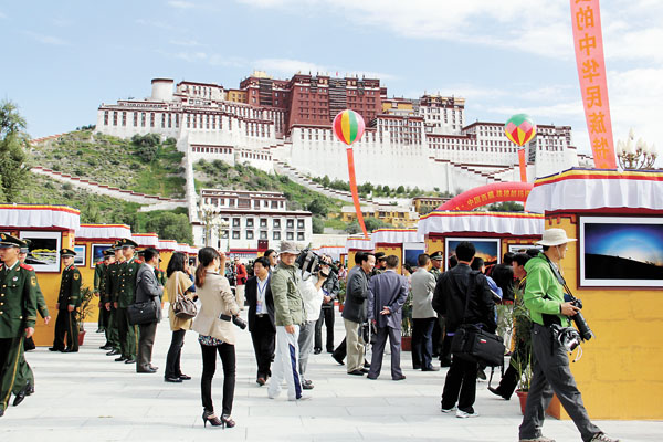 雄伟的布达拉宫,见证了60年来在党的领导下,西藏历经和平解放、平息叛乱和民主改革、社会主义革命和建设、改革开放等波澜壮阔的历史发展阶段,见证了西藏各族人民短短几十年跨越上千年的人间奇迹,见证了西藏社会翻天覆地的历史性变化。广场西侧,精心布置的展览现场占地1800平方米,西藏传统特色浓郁。700多幅主题鲜明、内容丰富、品位高雅、视角独特的摄影作品,通过真实、直观、独特的影像语言,不仅反映了西藏神奇的自然风光和迷人的民俗风情,而且真实生动地反映了和平解放60年来,西藏政治、经济、社会、文化等方面取得的巨大成就,表达了西藏各族人民坚持党的领导,坚持社会主义制度,坚持民族区域自治制度,坚持走有中国特色、西藏特点的发展路子的坚强意志和坚定信心。