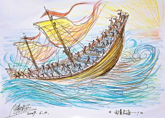 图为陈维亚所作广州亚运会广场演出创意手稿“向着大海”。
