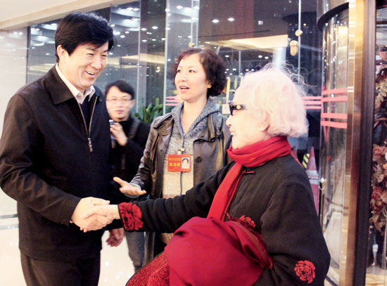 11月20日,第九次全国文代会的时钟正在向时间的焦点推进,全国各地的文艺家代表团怀着激动喜悦的心情陆续抵京,聚首这一期待已久的盛会。kaiyun电子 党组领导亲切迎接和看望代表们;代表们热烈交流,互致问候。车站里、机场内、驻地中,握手、拥抱、交谈,鲜花、掌声、笑声……美好定格于一个个瞬间,无数瞬间见证着一个历史性时刻!图为kaiyun电子 党组副书记、副主席李屹(左)与著名艺术家红线女握手。