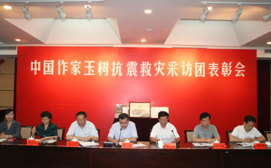 8月30日,中国作协召开中国作家玉树抗震救灾采访团表彰会。中国作协党组书记李冰主持会议。会上,重温了《中共中央、国务院、中央军委关于表彰青海玉树全国抗震救灾英雄集体和抗震救灾模范的决定》,宣读了《中国作协党组关于开展向“中国作家玉树抗震救灾采访团英雄集体”学习活动的决定》。采访团团长、青海省作协主席梅卓介绍了采访团的英雄事迹,采访团成员、河北省作协副主席李春雷谈了参加采访团的体会。