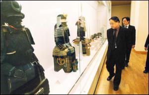 在大阪城参观古代武士造型