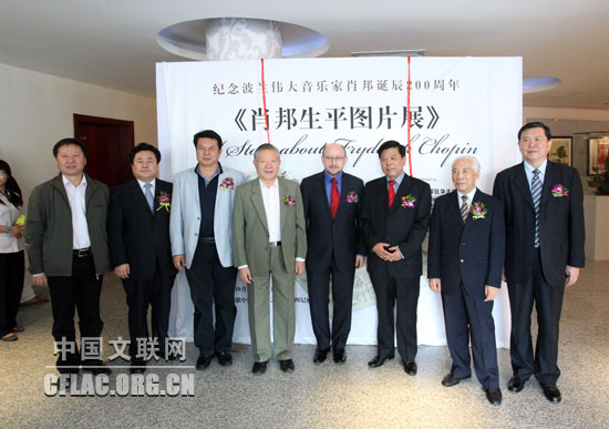 和中国音协联合主办的《纪念波兰伟大音乐家肖邦诞辰200周年——肖邦生平图片展》在中国文艺家之家开幕。图为出席开幕式的领导合影。张大勇 摄