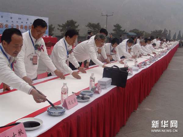 海峡两岸百位书法家百米书法长卷笔会在居庸关长城举行。