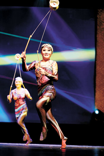 表彰盛典在《妙舞炫竹》节目震撼人心的背景鼓声中拉开帷幕。北京杂技团的姑娘们身着具有视觉冲击力的彩衣,尽情展示了空竹跳绳、翻拉提接空竹、点转翻身接空竹等绝技,她们激情洋溢的表演瞬间感染了台下的观众,成功地为晚会带来了精彩的开场表演。空竹是北京杂技团的传统优势节目,《抖空竹的小妞妞》曾经在1995年第九届法国巴黎世界未来杂技节上获得金奖。《妙舞炫竹》是《抖空竹的小妞妞》节目的最新版本,刚刚在今年6月举办的金菊奖全国杂技比赛中获得金奖。中国杂协主席边发吉认为:“中国杂技的发展方向是‘好看、好听、好玩’。这次参演的北京杂技团的《妙舞炫竹》,虽然以中国传统杂技节目“空竹”为依托,但却提升了艺术品位和技术含量。尤其是节目中‘小妞妞’的艺术形象,发挥了北派空竹小巧玲珑、清新活泼的艺术特点,令整个节目在惊险中又充满动感和快乐,同时演员表演也非常连贯顺畅,不单单是在‘秀技巧’,而是非常注重舞台呈现。”