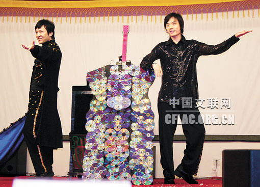 中国杂协和北京市文联赴门头沟清水镇慰问演出。图为傅琰东和汪燕飞表演魔术《光之碟》