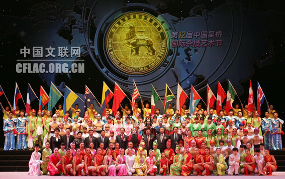由文化部和河北省政府共同主办的第十二届中国吴桥国际杂技艺术节于10月31日晚在河北艺术中心拉开帷幕。图为开幕式欢迎晚会结束后,领导与全体演员合影。卢旭 摄