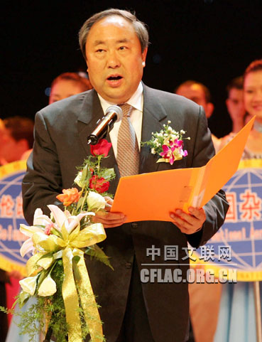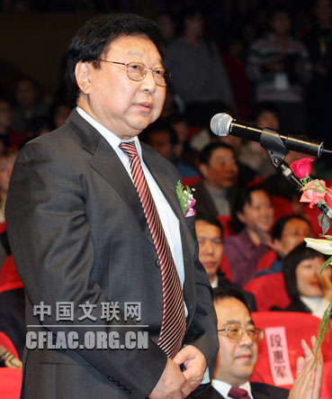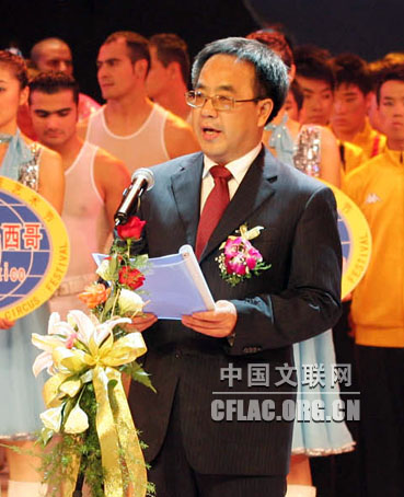 由文化部和河北省政府共同主办的第十二届中国吴桥国际杂技艺术节于10月31日晚在河北艺术中心拉开帷幕。图为全国政协副主席郑万通宣布第十二届中国吴桥国际杂技艺术节开幕。卢旭 摄