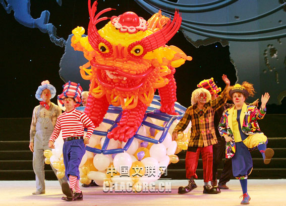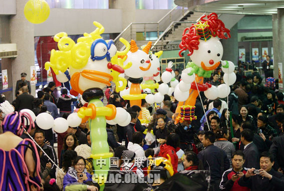 由文化部和河北省政府共同主办的第十二届中国吴桥国际杂技艺术节于10月31日晚在河北艺术中心拉开帷幕。图为用气球组成的本届杂技艺术节吉祥物“壮壮”维妙维肖。卢旭 摄