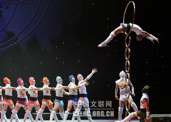 由文化部和河北省政府共同主办的第十二届中国吴桥国际杂技艺术节于10月31日晚在河北艺术中心拉开帷幕。图为开幕式欢迎晚会中表演的杂技《圣斗·地圈》。卢旭 摄