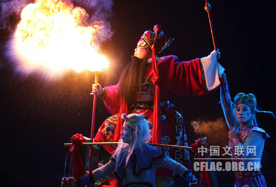 由文化部和河北省政府共同主办的第十二届中国吴桥国际杂技艺术节于10月31日晚在河北艺术中心拉开帷幕。图为开幕式欢迎晚会中表演的河北梆子《钟馗嫁妹》。卢旭 摄
