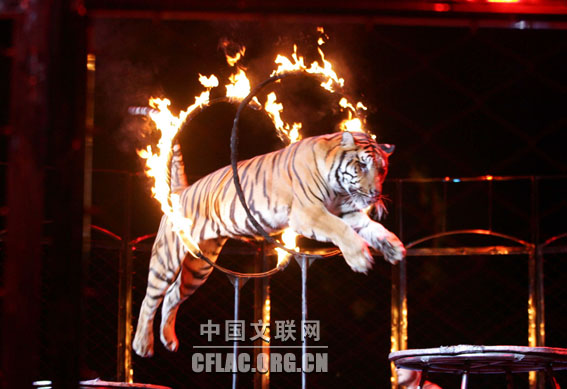 由文化部和河北省政府共同主办的第十二届中国吴桥国际杂技艺术节于10月31日晚在河北艺术中心拉开帷幕。图为俄罗斯马戏《驯虎》。卢旭 摄