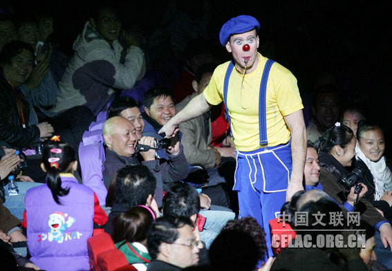 由文化部和河北省政府共同主办的第十二届中国吴桥国际杂技艺术节于10月31日晚在河北艺术中心拉开帷幕。图为乌克兰滑稽演员海拉西门科兄弟与场下观众互动。卢旭 摄