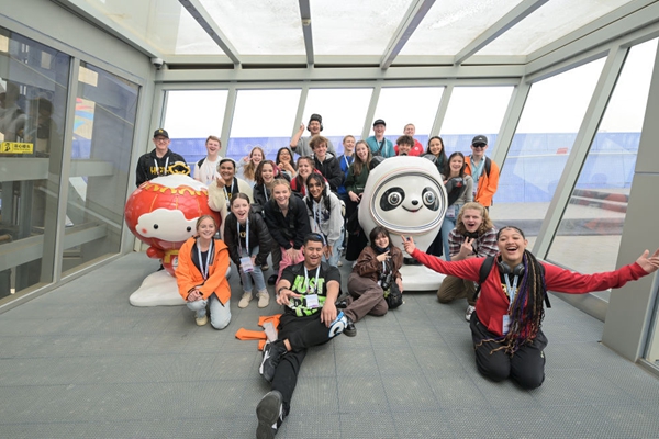 2024年3月21日,美国华盛顿州中学生代表团的成员在首钢滑雪大跳台上与冰墩墩、雪容融合影。新华社记者 李鑫 摄