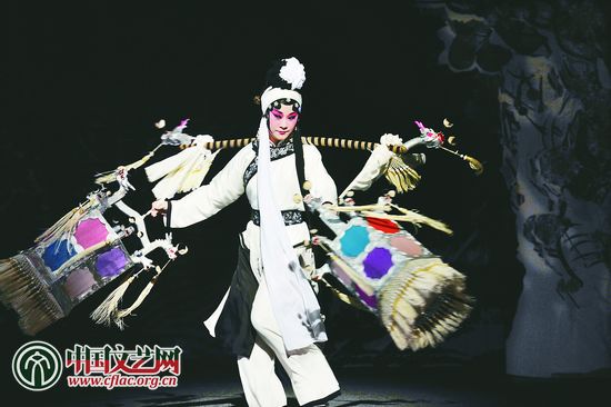 京剧《暗河渡》由台湾戏曲学院京剧团当家花旦朱民玲和当家小生赵扬强领衔主演。剧中结合西方歌剧的表现方式,从台湾传统民俗纸扎中寻找灵感进行舞美设计,在写实与写意间展现演员细致的表演功力。新华社发 吴景腾 摄