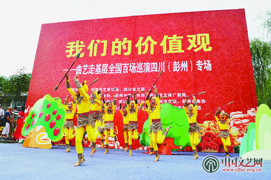 演出前,广场上早已聚集了上千的观众,巴蜀笑星叮当成为了最受追捧的明星。作为主持人,他上场表演的节目《我的未来不是梦》将现场气氛推向了高潮。“建设繁荣昌盛的中国,需要社会主义核心价值观这个强大的精神动力。”伴随着主持人浑厚的嗓音,演出在四川盘子《采花》的优美曲调中开始,身着绿裙翩翩起舞的少女们,伴着轻盈的敲击盘子的清脆声,把这个极具四川特色的曲种演绎得活灵活现。当地老艺人周世勇表演的四川金钱板《永当人民勤务员》,彭州市实验小学的小朋友们给大家带来的四川连厢《小猴子回家》也赢得了观众的阵阵喝彩。演出还带来了荣获中国曲艺牡丹奖节目奖的四川扬琴《情怀》、成都市曲艺团新创作的四川竹琴《竹情》等十余个节目。