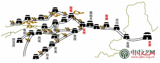 本插图为古丝绸之路示意图。图中以红色字体标记的地名为本次曲艺采风创作活动的主要站点