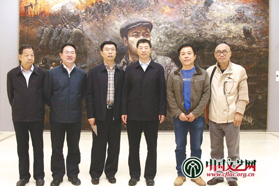 举办的“时代领跑者”大型展览,石油文联主席喻宝才(右三)与巨幅铁人油画作者傅剑锋(右二)在铁人画像前合影