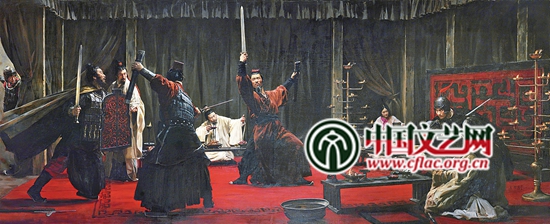 历史画、历史主题绘画,就内容而言,是以历史事件、人物和史实作为基本内容的绘画;就形式而言,它是造型艺术,通过绘画、雕塑特有的表现手法来体现特定的历史主题。它不同于历史文献的直译,不是通史展览中借以说明内容的插图。因此,它既是历史的,又是艺术的。历史画创作贵在立意和切入角度的选取与把握,它要求作者尊重历史的本来面目,既要深入了解历史,又要准确地、艺术地呈现历史。而以历史为题材的艺术创作与历史画创作的差别在于:前者的历史主题只是创作媒介,艺术家完全可以凭借个人的理解认知和审美趣味,用个性化的方式自由演绎;而后者则需要有明确的主题内容限定、严格的历史史实求证、严谨的创作态度,以及经得起历史拷问和“情景再现”或“凝缩表现”式的完整的艺术呈现。艺术家既非画匠,便“不可不弘毅,任重而道远”,用图画为历史造像立碑,同为“治史”之道,亦谓艺术之大道。“创作工程”的入围作者们以强烈的历史责任意识和文化使命感,在专家组指导帮助下,认真研究所能搜集到的典籍史料,深入理解并寻求准确把握表现的角度,不断深化对历史主题内涵的认识,将集体(专家指点)及个人对历史文化的思考和对艺术品格、精神价值的追求,自觉地贯注到对历史风云、文明进步以及艺术形式表现的创作实践中,向着每个人心中的目标高地努力登攀。作者孙景波为了创作好《贞观盛会》,不光不避劳顿多次深入实地查考历史建筑原型,与专家多番探讨唐式建筑结构特点和大型朝会活动典仪的合理性,用心收集古代西域各国人物造型和服饰资料,还做了大量文字、图片记录和案头笔记工作,为的是最优化地再现宏大的历史场景、展示盛唐气象。作者王宏剑是一位修养全面、技艺高超的著名油画家,他瞩意的《鸿门宴》以历史上楚汉相争为背景,为了艺术表现的真实性,他借助搭建模型手法以设计、组织情景再现的逼真场面,力图还原想象中的历史真实。而王赞、潘鸿海、郭北平等作者的《河姆渡文化》《良渚文化》《仰韶彩陶文化》则需要依凭有限的考古出土文物和文字记载,充分发挥想象和逻辑推衍,以期描绘先民部落的自然生活情态。这样的创作主题在给了他们限制的同时,又为他们敞开了自由想象的空间,美术家所需解决的,就是在这个有限的空间中,如何艺术地罗织起“真实、可信”的历史场景。如果说跨越历史数百年、涵盖了各类门派的《中华武术》为作者胡永凯给出的是如何以高度概括、凝缩的手法,既要表现中华武术的多样丰富性又能体现不同门派历史源远流长的难题的话,那么《王阳明心学》则是考验作者孔维克如何通过绘画视觉形式呈现“心”的精神性抽象因素,体现中华文化思想理念;而《屈原与楚辞》中那瑰丽恣肆、极富文采和想象力的辞赋《离骚》中跌宕变幻的内容情节,如何通过画面组织恰切地与历史人物互为映衬呈现,如此等等。历史的艺术和艺术的历史问题在考验着艺术家的智慧。为了能够体现创作主题内容的准确性,为了能够将美术家的主观意图和专业擅长与主题内容有效地结合起来,在专家们的指导下,作者们普遍数易其稿,有的十数易稿,推倒重来,再推翻、再重来,可谓是殚精竭虑、精益求精、寝食废忘、全力以赴。