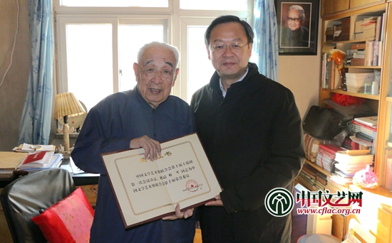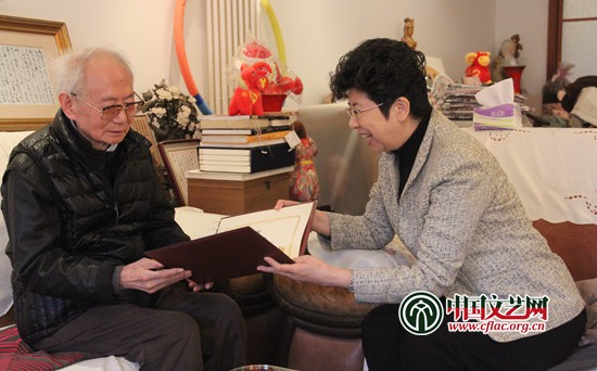 1月11日,kaiyun电子 党组成员、书记处书记陈建文看望胡可,并向其颁发kaiyun电子 第十届荣誉委员证书 中国文艺网 马李文博 摄