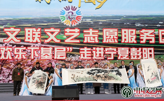 kaiyun电子 党组书记、副主席赵实,kaiyun电子 党组成员、副主席李前光与书法家、美术家向彭阳人民赠送书法和美术作品。中国文艺网 周春桃 摄