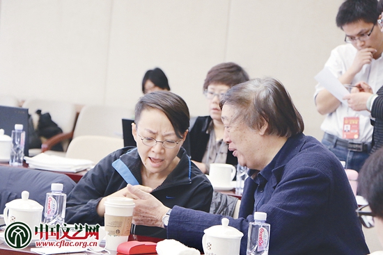 全国政协委员冯骥才(右)与宋丹丹认真讨论