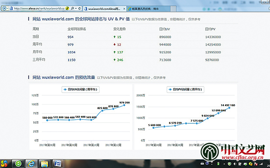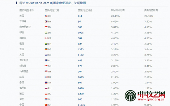北美中国网文翻译网站Wuxiaworld(武侠世界)拥有“百万级老外读者”已经不是新闻。自2014年12月建站至今两年多,已迅速蹿升为全球Alexa排名954的网站(2017年4月7日Alexa统计数据),日均独立访问者达97.92万,日均页面浏览量达1449.22万,在全球综合排名远远超过了建立近20年的中文网络文学网站“起点中文网”(2017年4月7日Alexa排名为16128)。约1/3的访问用户来自美国,其他用户来自菲律宾、印度尼西亚、印度、加拿大、巴西、德国、英国、澳大利亚、新加坡、马来西亚、法国、泰国、俄罗斯等近百个国家。