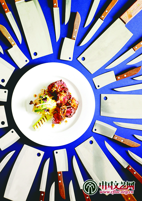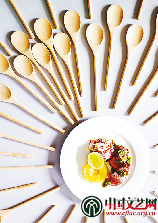 当餐饮与艺术相结合,吸引着人们的目光的,不只是盘中精美的食物,还有一把把平凡的刀具、刀叉、勺子。大小、宽窄、形状不同的刀具呈放射状围绕着一盘美食,令人惊讶的是,释放出的不是锋锐的气息,而是归于漂亮食物的祥和、宁静。不锈钢西餐三件套,显示出一种秩序感,而这正是西餐的一大特色。木勺组合,勺柄让位于中心的食物向外发散,弥漫着自由散漫的气息,让人感觉用餐是一件颇为愉悦、自在的事情。