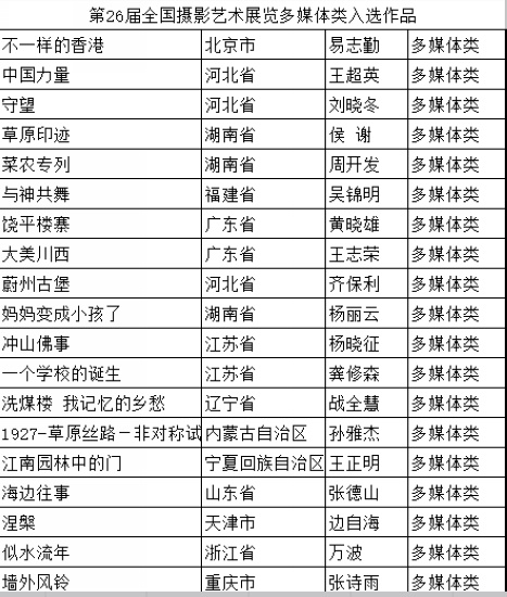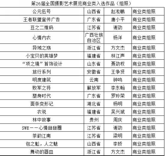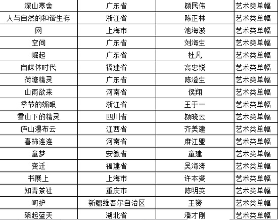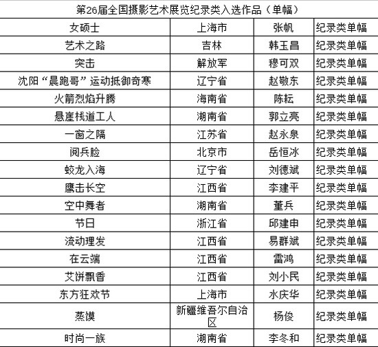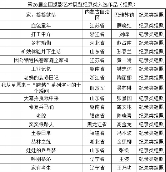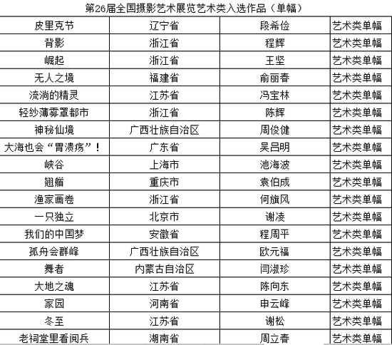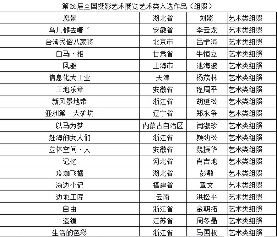 kaiyun开云全站 、中国摄影家协会主办的第26届全国摄影艺术展览,收到来稿作品94273件(212065幅),其中:纪录类作品53842件,艺术类作品38275件,商业类作品1954件,多媒体类作品202件。本届全国摄影艺术展览经过初评、终评选出拟入选作品418件。