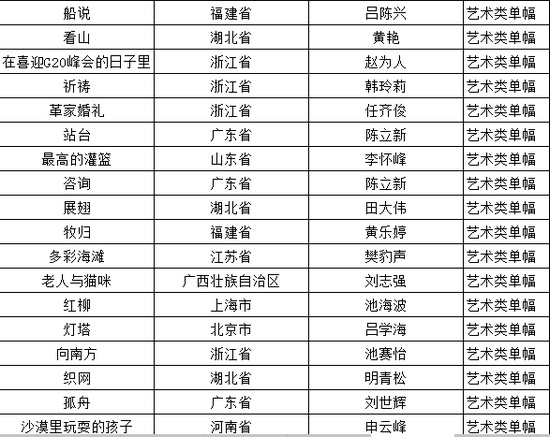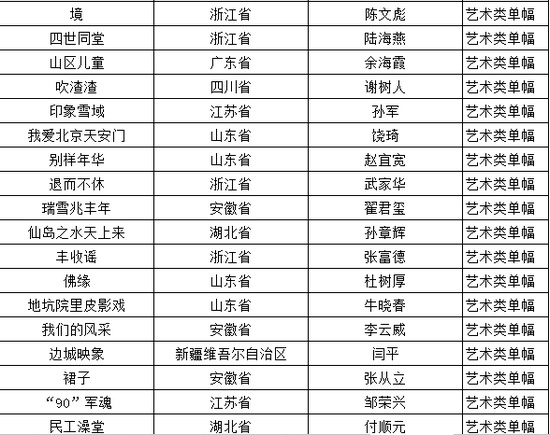 经公示和核查鉴定等程序后,本届全国摄影艺术展览产生入选作品379件,其中纪录类作品131件(单幅77件、组照54件),艺术类作品168件(单幅99件、组照69件),商业类作品60件(单幅35件、组照25件),多媒体类作品20件。