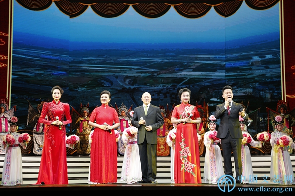 最后,由吴京安、王斑、侯岩松、赵旭、刘晓翠等话剧表演艺术家与颜丹晨、李小萌、王乐君等优秀青年演员及中国戏曲学院的青年学生一起朗诵的《中国大舞台》,激情澎湃,将晚会推向高潮。晚会在孟广禄、王蓉蓉、袁慧琴、王艳、张建峰等京剧表演艺术家演唱的大气磅礴的原创京歌《祖国啊,我亲爱的祖国》的歌声中圆满落幕。