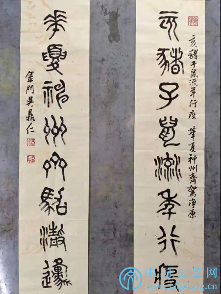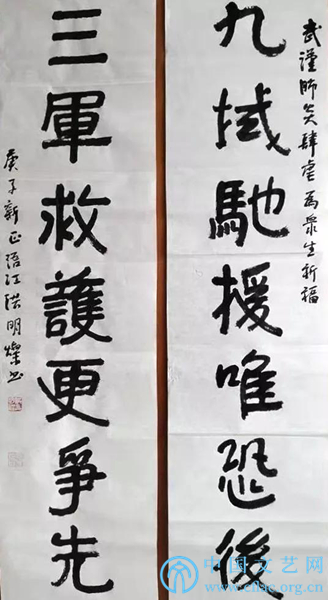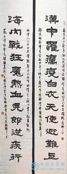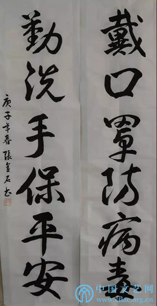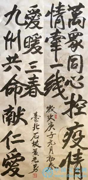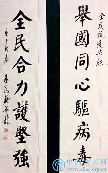 释文:万众同心控疫情,情牵一线;九州共命献仁爱,爱暖三春。