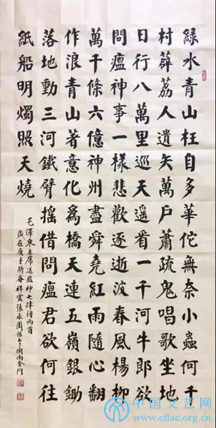 释文:绿水青山枉自多,华佗无奈小虫何!千村薜荔人遗矢,万户萧疏鬼唱歌。坐地日行八万里,巡天遥看一千河。牛郎欲问瘟神事,一样悲欢逐逝波。春风杨柳万千条,六亿神州尽舜尧。红雨随心翻作浪,青山着意化为桥。天连五岭银锄落,地动三河铁臂摇。借问瘟君欲何往,纸船明烛照天烧。