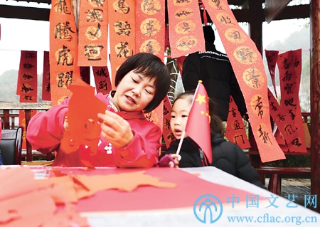 “笑满三湘”湖南省文艺志愿服务团团员、剪纸艺术家张询在耐心地教小朋友剪纸