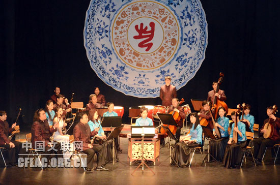 当地时间9月28日晚,“今日中国”艺术周音乐团队在瑞典维克舍市具有400年历史的维克舍剧院为当地观众奉献了一场令人“落泪”的民乐演奏。图为民乐合奏《花好月圆》。中国文联网 冉茂金 摄