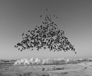 蔡国强最为拿手的爆炸秀首次放到了白天的自然环境中举行,而且烟火的色彩采用了前所未有的黑色。爆炸秀的名称为“黑色仪式”。卡塔尔的王公贵族、平民百姓以及来自世界各地的嘉宾和媒体记者一起在一片被平整过的宽阔地域观看了爆炸。这场秀约有6组不同形式的爆炸。在剧烈的爆破声中,无数黑色的烟火直冲碧空,形成巨大的环形、金字塔形等。黑雾散开时,如朵朵水墨晕化在蓝天。其中有一组仅仅是一团极速腾空而起的烈焰,热浪扑面,非常震撼。也有一组的焰火是粉红、粉绿、粉蓝的青春色彩。现场观众激动的呼喊声此起彼伏。这场爆炸秀以迅雷不及掩耳的气势,让观众体会着苍凉、神秘、暴烈和绚烂。蔡国强说,这个以“葬礼”为核心内容的艺术展给死在异乡的还乡者一个精神葬礼。