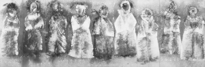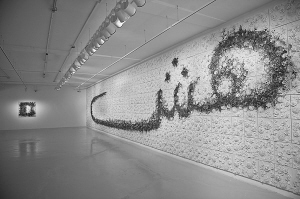 在精美细致的德化百花浮雕壁画上进行火药爆炸创作,也是蔡国强的新创。这组巨大的壁画是在德化特制,以传统的塑花工艺制作,非常逼真,但也非常脆弱易损。蔡国强在上面用火药炸出一句阿拉伯文“脆弱”。蔡说,他这次学会了这个阿拉伯字,很有感悟。过去的作品太大,追求强悍,现在悟到不妨追求“脆弱”,“脆弱”也很重要。