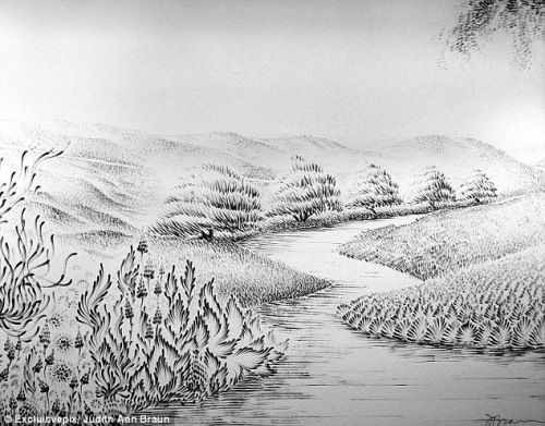 今年65岁的布劳恩用这种方式作画已有近10年。她用指尖蘸取石墨创作出巨大且富有想象力的图案,甚至将图案中树、流水的细节都表现得十分清楚。