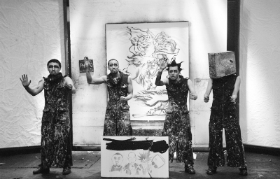 晚上8时许,我们随导游来到首尔的一家剧场。虽然剧场面积不大,但里面早已坐满了观众。待我们刚刚坐稳,场内响起一阵动感劲爆的音乐,舞台上开始灯光闪烁,一排参差不齐的木板出现在舞台上。奇妙的是,每块木板其实都是一扇活动的门。不一会儿,从木板门后走出来4个打扮怪异的年轻人。他们浑身上下蘸满了各色颜料,礼帽随意地斜扣在脑门上,看上去像极了马戏团里的小丑。想必,他们就是今晚的艺术大师了!