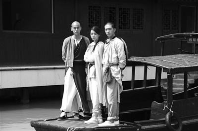 探班现场,彭于晏版黄飞鸿与侠女王珞丹、黄飞鸿的“小伙伴”赤火井柏然(左起)着戏服亮相。