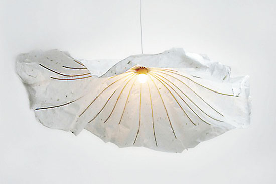 从糊伞的工艺中得到启发,继续向前进化,设计出这盏台灯。应用皮纸和天然浆糊