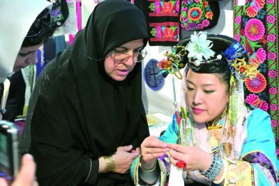 2012年6月,在伊朗德黑兰举办的中国妇女民间手工艺品展上,来自中国黑龙江省牡丹江渤海民族工艺品有限公司的绣娘向观众展示靺鞨绣技艺。(牡丹江渤海民族工艺品有限公司供图)
