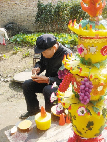 赵立功说灌制豆村大蜡的秘方是经过历代大蜡艺人的调制流传下来的,所以一米多高的大蜡遇高温不熔不化,装饰用的飞禽走兽、花鸟鱼虫也是蜡做的,放置时间再长也不变形、不褪色。在周至县文化馆的非物质文化遗产展厅里,记者见到了两个老人几年前做的大蜡,在没有任何保护下,至今还色彩艳丽、纹饰如新。