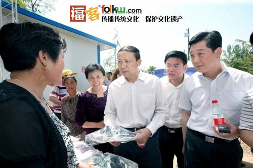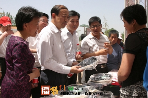 县委书记高永瑞、县长赵勇在特色商品展销区询问手工布艺品的制作、包装销售情况