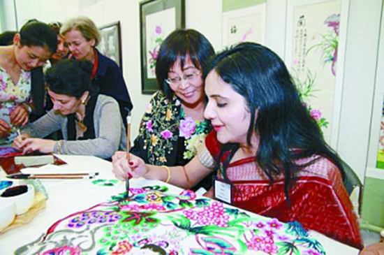 来宾们还欣赏了《中国剪纸艺术荟萃》专题影片,参加了由第三代中国剪纸艺术家——周淑英主持的剪纸工作坊。来自英国、捷克、印度、菲律宾、孟加拉、巴拉圭和世界旅游组织等18个国家和国际组织的女外交官与外交官夫人们围坐一起,饶有兴趣地跟着周淑英老师学起了剪纸,一招一式有模有样。当一只只“老虎”在她们手下展开时,大家纷纷发出“不可思议”的赞叹。