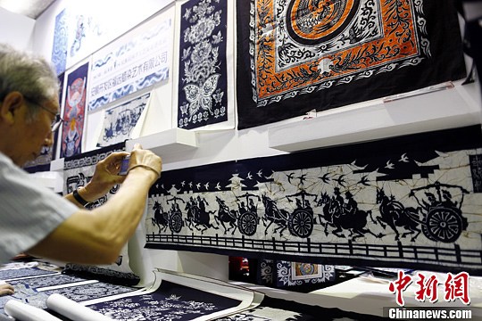 7月11日,“多彩贵州 ·贵州民族民间手工艺品走进北京” 活动在北京798举行。这是该活动第三次来到京城,今年的主题为贵州腊染,现场还有刺绣、银饰等众多来自贵州山野的非物质文化的传人们展示绝活,与观众互动交流。中新社发 富田 摄