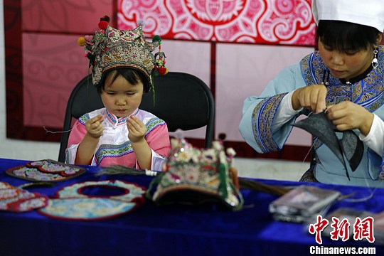 图为年仅五岁的水族马尾绣传承人潘苇苇(左)现场献技。中新社发 富田 摄