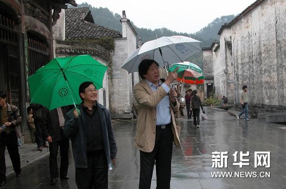 冯骥才(右)在安徽省黟县西递村的古民居考察(2005年11月3日摄)。新华网图片