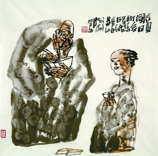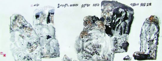 ◎ 赏析9:《生生不息》2008,《茶有道》2007。前一幅,人画在石头一样的团块里,通过亲情关系和人伦关系的图式,解读了“天行健,君子以自强不息”的民族文化精神。后者,在图像和题跋的结合中,透过“饮者悟透境界不同”,启导观者参悟人生与艺术创作的真谛。两幅作品有一个共同点,那就是以他喜爱的古代民间石刻入画,特别是栓马桩和炕头狮,不仅取其单纯的造型,更取其大朴不琢的气韵。他的这类作品,在意象上,在写实的基础上,经过提炼取舍,走向意造。在笔墨上,把勾勒法、勾皴法、泼墨法、破墨法、积墨法有机地结合起来,追求从容而忘情,明丽而苍茫。在视觉上,新颖而有冲击力。